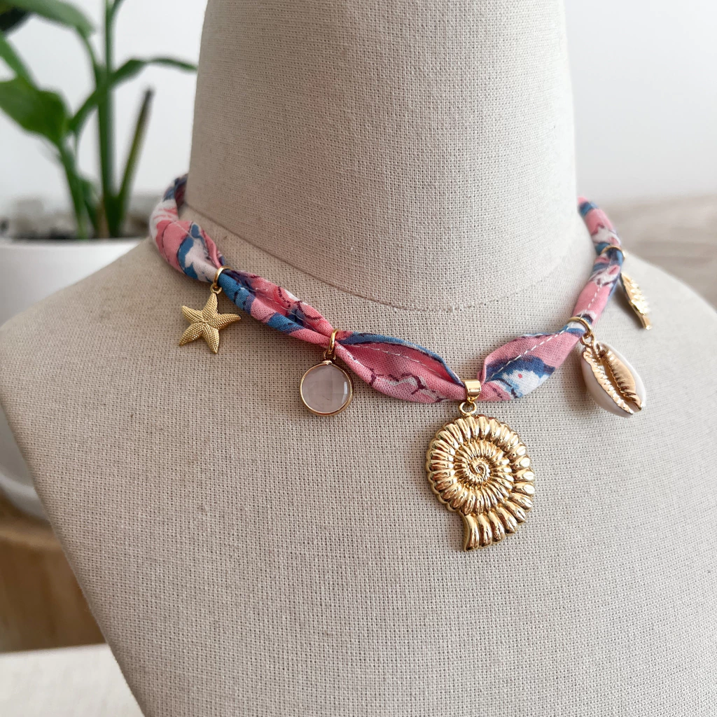 Lazo de tela block print de la India con dijes varios y buzio espiral central, todos de goldfilled.